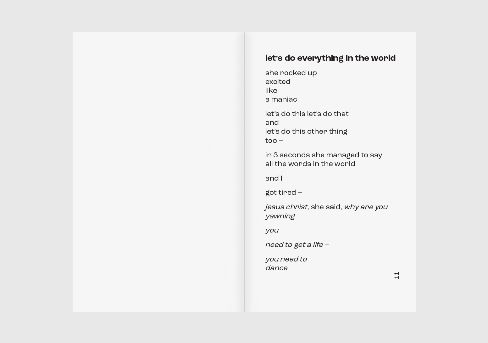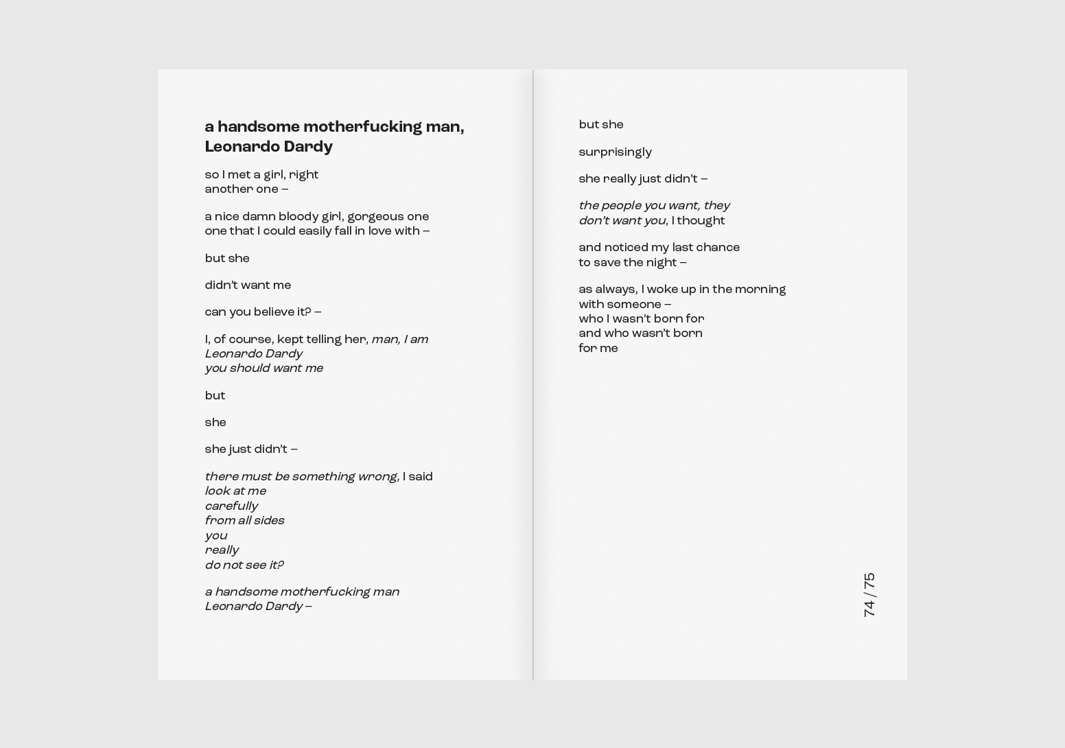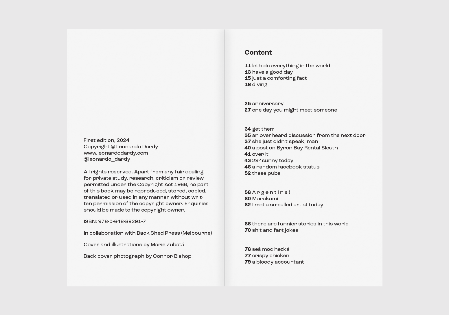 WITH IRONY, SARCASM AND MELANCHOLY UNDER THE BANNER OF HUMOUR; THROUGH WILD PARTIES AND SAD HANGOVERS, BOREDOM AS WELL AS THE SUPERFICIALITY OF BEAUTY, ONE MAY SEE THE SUN SEEPING, THE EXACT SUN THE AUTHOR METAPHORICALLY AVOIDS – AND TO WHICH HE, FINALLY AND IRONICALLY, DEDICATES THE ENTIRE COLLECTION. TAKE A TRIP WITH LEONARDO DARDY – A TRIP HE MOST LIKELY WOULDN’T JOIN YOU ON AS HE’D PREFER TO STAY HOME – TO EXPLORE THE INTRIGUING LIFE OF HIS